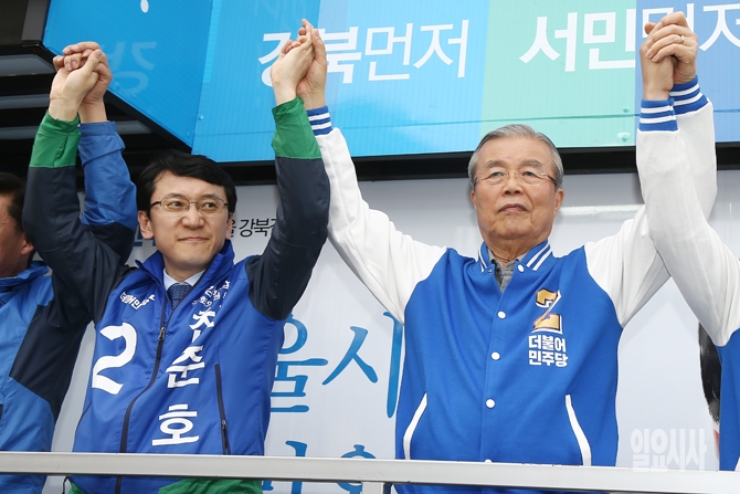 6일 오후 서울 강북구에서 천준호 더불어민주당 후보와 천후보의 지원유세에 나선 김종인 더불어민주당 비대위 대표가 지지자들의 환호에 응답하고 있다.