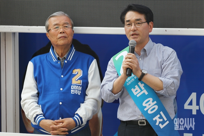 6일 오후 서울 강북구에서 박용진 더불어민주당 후보가 유권자들에게 지지를 호소하고 있다.