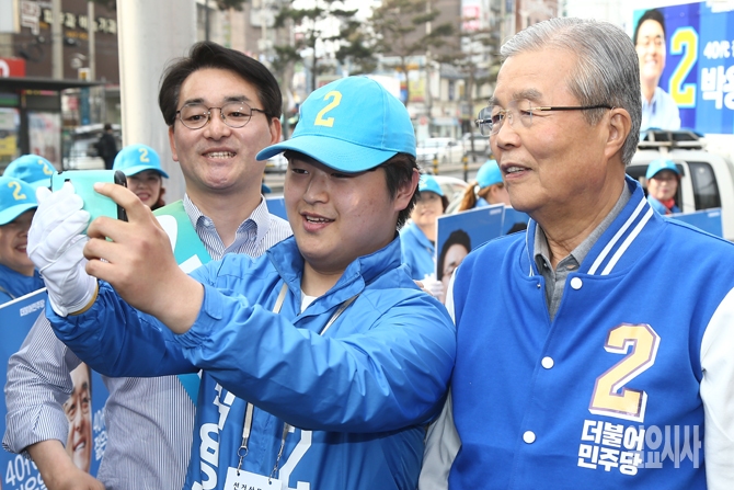 6일 오후 서울 강북구에서 박용진 더불어민주당 후보와 박후보의 지원유세에 나선 김종인 더불어민주당 비대위 대표가 선거운동원과 사진을 찍고 있다.
