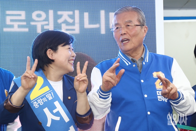 6일 오후 서울 중랑구 상봉터미널 앞에서 서영교 더불어민주당 후보와 서후보의 지원유세에 나선 김종인 더불어민주당 비대위 대표가 율동 중 대화를 하고 있다.