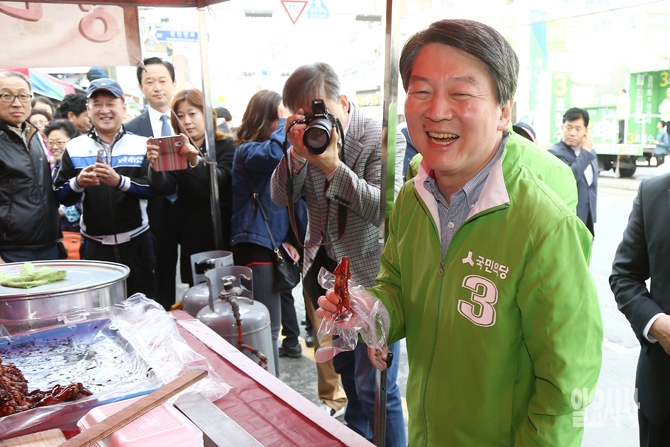 7일 오전 경기도 남양주시 진접읍 진접농협 앞에서 표철수 국민의당 후보의 지원유세에 나선 안철수 국민의당 공동대표가 시장상인이 건낸 족발을 들고 환하게 웃고 있다.