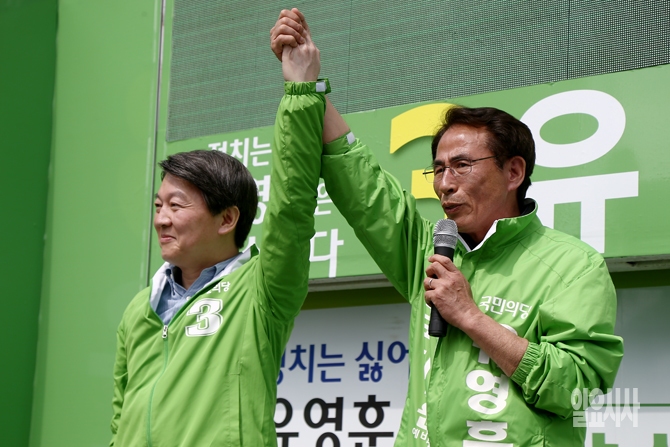 7일 오전 경기도 남양주시 호평동 이마트 남양주점 앞에서 유영훈 국민의당 후보가 유후보의 지원유세에 나선 안철수 국민의당 공동대표의 손을 들고 유권자들에게 지지를 호소하고 있다.