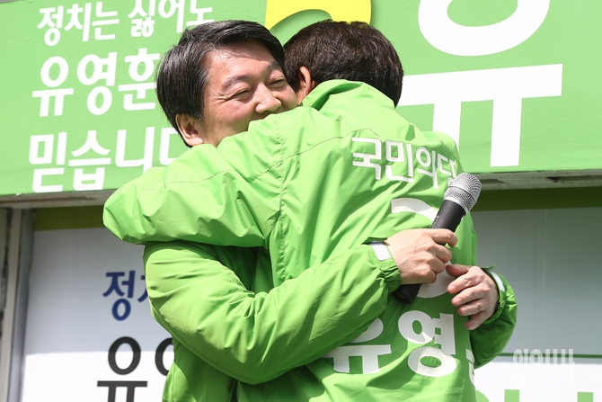 7일 오전 경기도 남양주시 호평동 이마트 남양주점 앞에서 유영훈 국민의당 후보와 유후보의 지원유세에 나선 안철수 국민의당 공동대표가 포옹을 하고 있다.