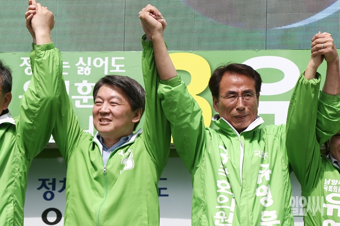 7일 오전 경기도 남양주시 호평동 이마트 남양주점 앞에서 유영훈 국민의당 후보와 유후보의 지원유세에 나선 안철수 국민의당 공동대표가 지지자들의 환호에 응답하고 있다.