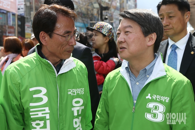 7일 오전 경기도 남양주시 호평동 이마트 남양주점 앞에서 유영훈 국민의당 후보와 유후보의 지원유세에 나선 안철수 국민의당 공동대표가 대화를 나누고 있다.
