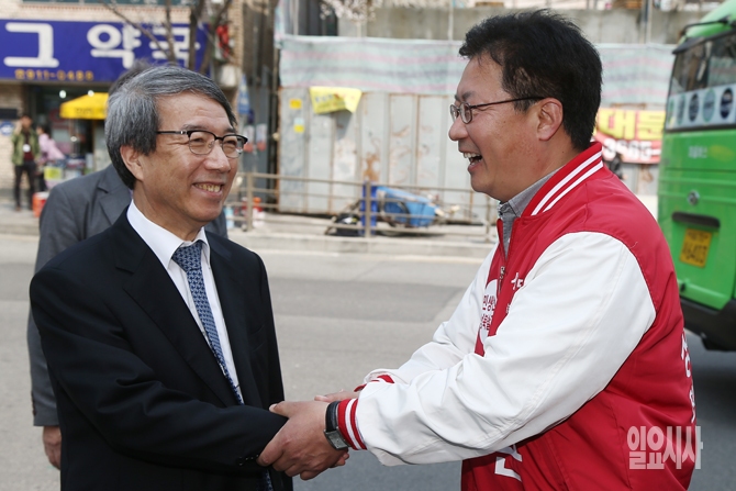 7일 오후 서울 성북구 정릉시장 앞에서 정태근 새누리당 후보가 정후보가 정운찬 전 국무총리와 악수를 하고 있다.