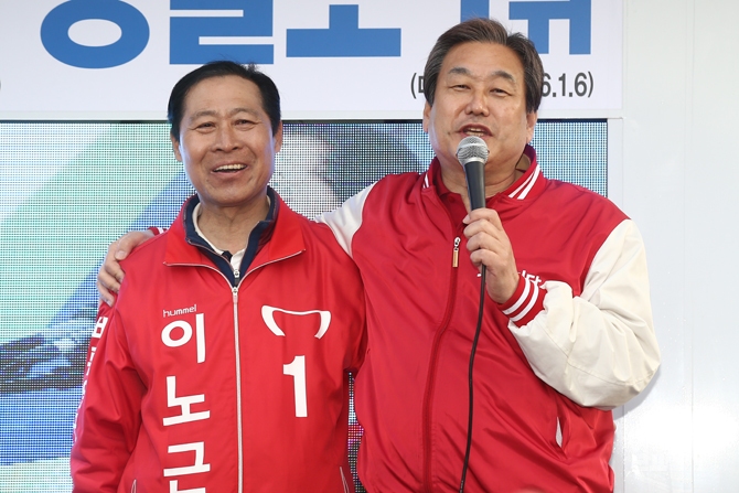 7일 오후 서울 노원구 화랑로 채림웨딩홀 앞에서 이노근 새누리당 후보의 지원유세에 나선 김무성 새누리당 대표가 유권자들에게 지지를 호소하고 있다.