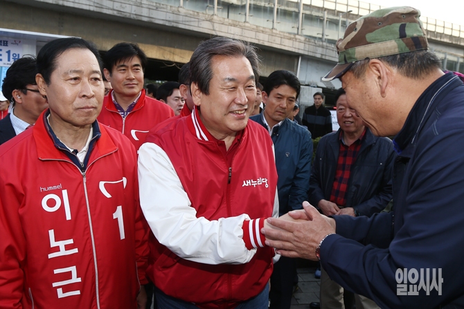 7일 오후 서울 노원구 화랑로 채림웨딩홀 앞에서 이노근 새누리당 후보와 이후보의 지원유세에 나선 김무성 새누리당 대표가 유권자들과 악수를 하고 있다.