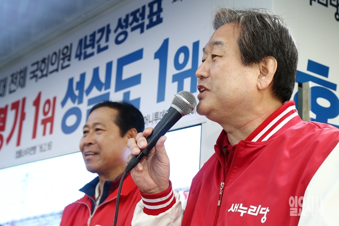 7일 오후 서울 노원구 화랑로 채림웨딩홀 앞에서 이노근 새누리당 후보의 지원유세에 나선 김무성 새누리당 대표가 유권자들에게 지지를 호소하고 있다.