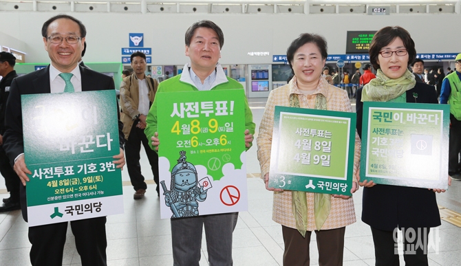 제20대 국회의원 선거 사전투표일인 8일 오전 서울역에서 안철수 국민의당 공동대표가 사전투표 독려 캠페인을 갖고 있다.