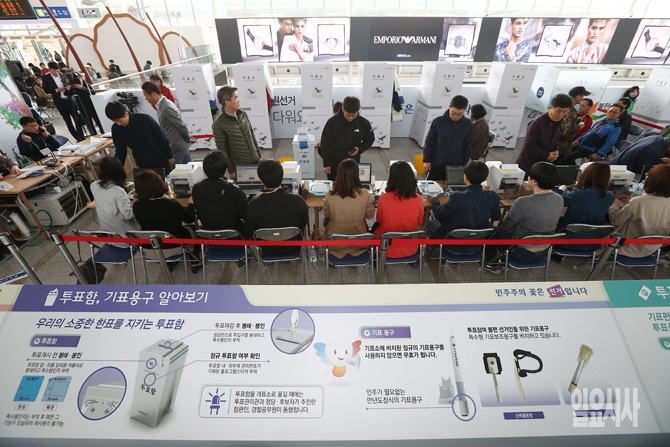 제20대 국회의원선거 사전투표 시작일인 8일 오전 서울역에 사전투표소가 설치되어 있다.