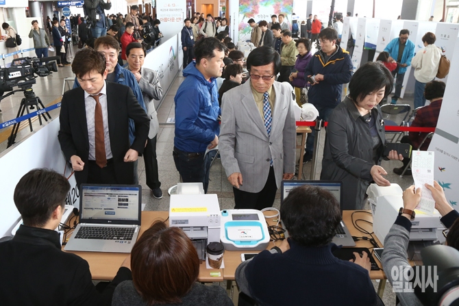 제20대 국회의원선거 사전투표 시작일인 8일 오전 서울역에 설치된 사전투표소를 찾은 유권자들이 투표를 위해 본인 확인 절차 및 투표 용지 수령을 하고 있다.