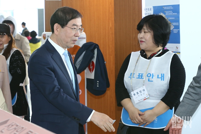 제20대 국회의원선거 사전투표 시작일인 8일 오전 서울역에 설치된 사전투표소에 박원순 서울시장이 입장하고 있다.