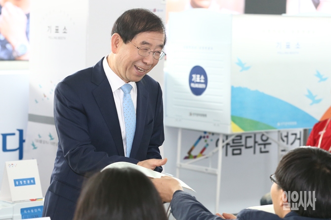 제20대 국회의원선거 사전투표 시작일인 8일 오전 서울역에 설치된 사전투표소를 찾은 박원순 서울시장이 투표용지를 수령하고 있다.