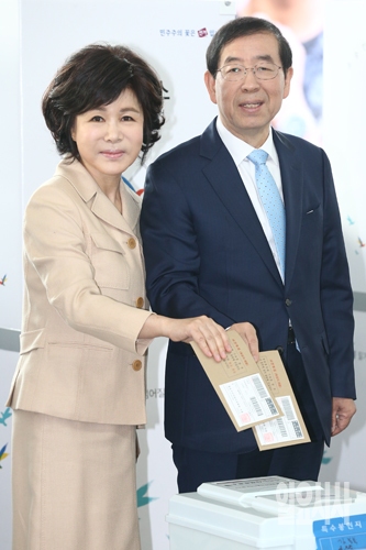 제20대 국회의원선거 사전투표 시작일인 8일 오전 서울역에 설치된 사전투표소를 찾은 박원순 서울시장이 부인 강난희씨와 투표를 하고 있다.