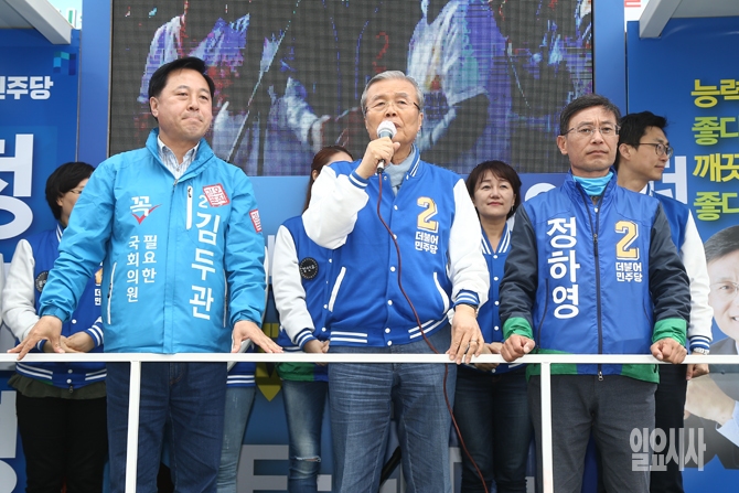 8일 오후 경기도 김포시 장기동에서 더불어민주당 김두관 김포갑 후보와 정하영 김포을 후보의 지원유세에 나선 김종인 더불어민주당 비대위 대표가 유권자들에게 지지를 호소하고 있다.