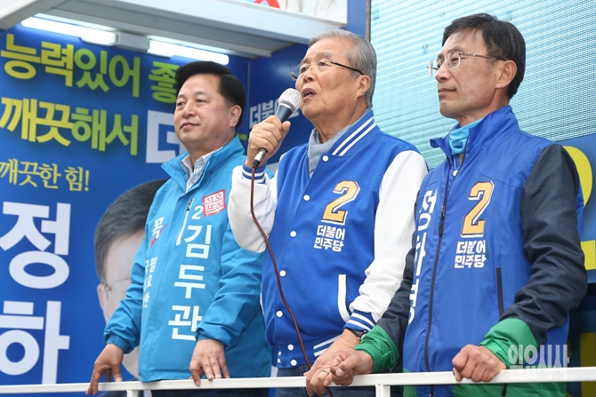 8일 오후 경기도 김포시 장기동에서 더불어민주당 김두관 김포갑 후보와 정하영 김포을 후보의 지원유세에 나선 김종인 더불어민주당 비대위 대표가 유권자들에게 지지를 호소하고 있다.