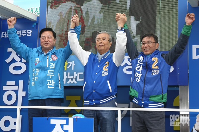 8일 오후 경기도 김포시 장기동에서 더불어민주당 김두관 김포갑 후보와 정하영 김포을 후보의 지원유세에 나선 김종인 더불어민주당 비대위 대표가 지지자들의 환호에 응답하고 있다.