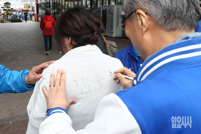 8일 오후 경기도 김포시 장기동에서 더불어민주당 김두관 김포갑 후보와 정하영 김포을 후보의 지원유세를 마친 김종인 더불어민주당 비대위 대표가 지지자의 옷에 사인을 하고 있다.
