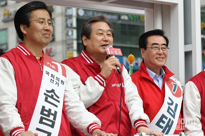 8일 오후 경기도 고양시 화정역 광장에서 새누리당 손범규 고양갑 후보와 김태원 고양을 후보의 지원유세에 나선 김무성 새누리당 대표가 유권자들에게 지지를 호소하고 있다.