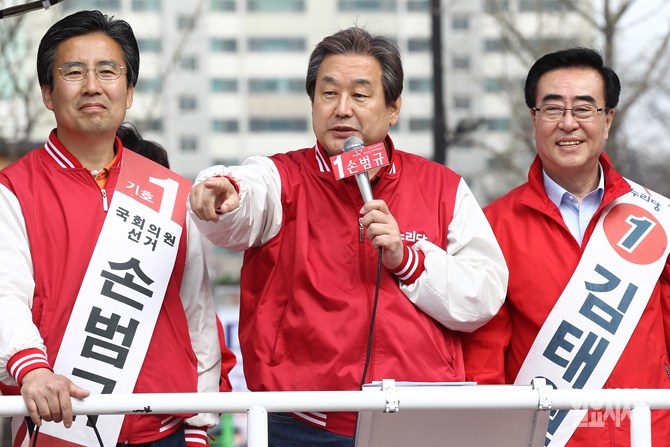 8일 오후 경기도 고양시 화정역 광장에서 새누리당 손범규 고양갑 후보와 김태원 고양을 후보의 지원유세에 나선 김무성 새누리당 대표가 선거유세 중 한 지지자가 문재인 더불어민주당 전 대표와 심상정 정의당 대표를 빨갱이라고 외치자 지지자의 발언을 막고 있다.