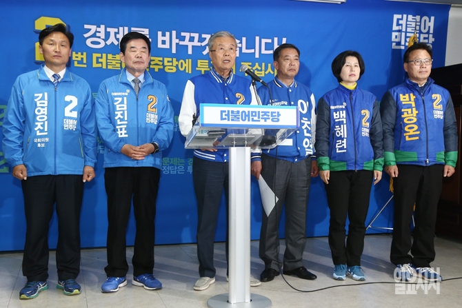 4.13 총선이 이틀 앞으로 다가온 가운데 11일 오전 경기도 수원시 장안구 더불어민주당 경기도당 회의실에서 김종인 더불어민주당 비대위 대표가 대국민 성명 발표를 갖고 있다.
