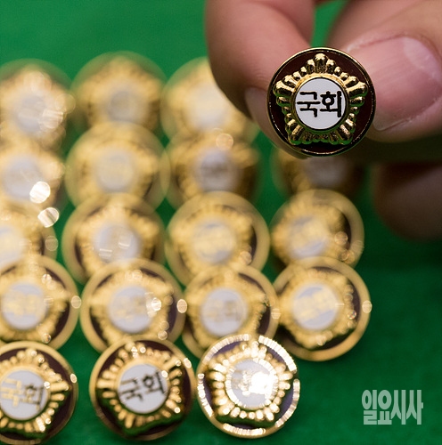 4·13총선을 이틀 앞둔 11일, 서울 여의도 국회 의원식당에 20대 국회 배지가 언론을 통해 공개되고 있다.