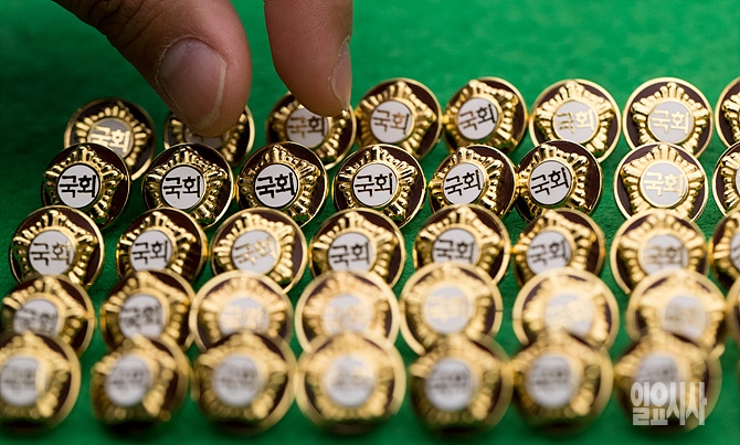 4·13총선을 이틀 앞둔 11일, 서울 여의도 국회 의원식당에 20대 국회 배지가 언론을 통해 공개되고 있다.
