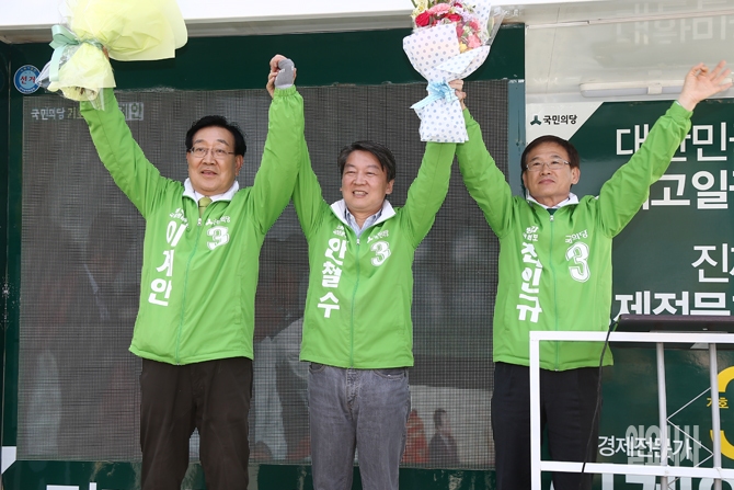 4.13 총선이 이틀 앞으로 다가온 가운데 11일 오전 경기도 평택시 평택역 앞 광장에서 국민의당 최인규, 이계안 후보의 지원유세에 나선 안철수 국민의당 공동대표가 지지자들의 환호에 응답하고 있다.