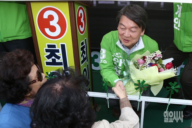 4.13 총선이 이틀 앞으로 다가온 가운데 11일 오전 경기도 평택시 평택역 앞 광장에서 국민의당 최인규, 이계안 후보의 지원유세에 나선 안철수 국민의당 공동대표가 지지자들과 악수를 하고 있다.