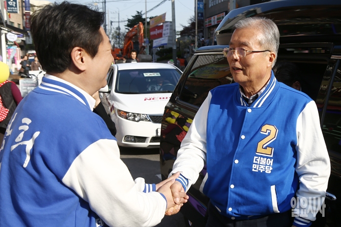 4.13 총선이 이틀 앞으로 다가온 가운데 11일 오전 서울 양천구 목3동시장에서 황희 더불어민주당 후보와 황후보의 지원유세에 나선 김종인 더불어민주당 비대위 대표가 악수를 하고 있다.