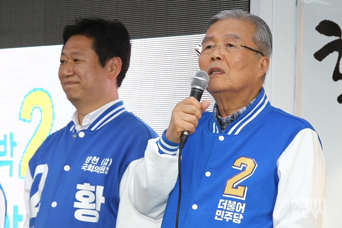 4.13 총선이 이틀 앞으로 다가온 가운데 11일 오전 서울 양천구 목3동시장에서 황희 더불어민주당 후보와 황후보의 지원유세에 나선 김종인 더불어민주당 비대위 대표가 유권자들에게 지지를 호소하고 있다.