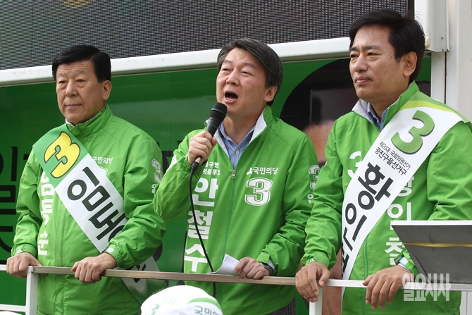 4.13 총선이 하루 앞으로 다가온 가운데 12일 오전 서울 광진구 어린이대공원 후문에서 국민의당 임동순, 황인철 후보의 지원유세에 나선 안철수 국민의당 공동대표가 유권자들에게 지지를 호소하고 있다.