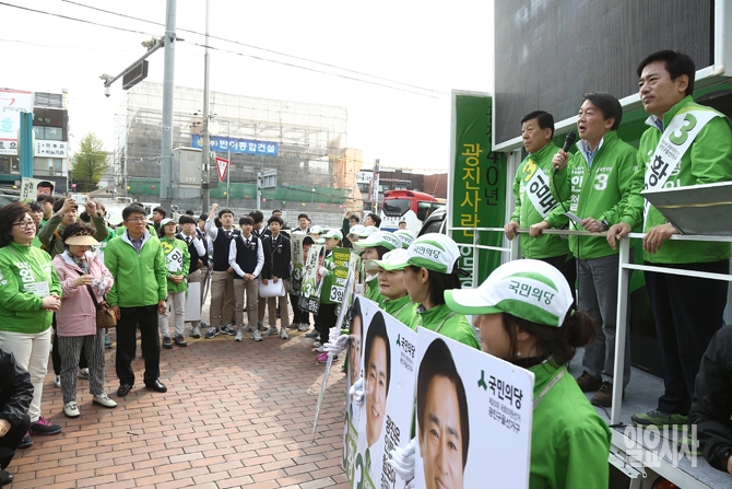 4.13 총선이 하루 앞으로 다가온 가운데 12일 오전 서울 광진구 어린이대공원 후문에서 국민의당 임동순, 황인철 후보의 지원유세에 나선 안철수 국민의당 공동대표가 유권자들에게 지지를 호소하고 있다.