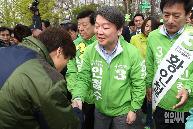 4.13 총선이 하루 앞으로 다가온 가운데 12일 오전 서울 광진구 어린이대공원 후문에서 국민의당 임동순, 황인철 후보의 지원유세에 나선 안철수 국민의당 공동대표가 유권자들과 악수를 하고 있다.