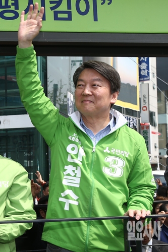 4.13 총선이 하루 앞으로 다가온 가운데 12일 오전 서울 은평구 불광역에서 고연호 국민의당 후보의 지원유세에 나선 안철수 국민의당 공동대표가 유권자들에게 인사를 하고 있다.