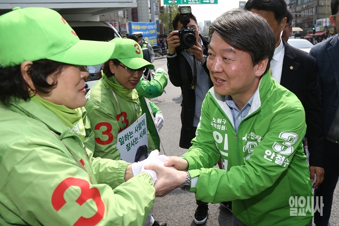 4.13 총선이 하루 앞으로 다가온 가운데 12일 오전 서울 은평구 불광역에서 고연호 국민의당 후보의 지원유세에 나선 안철수 국민의당 공동대표가 선거운동원들과 악수를 하고 있다.
