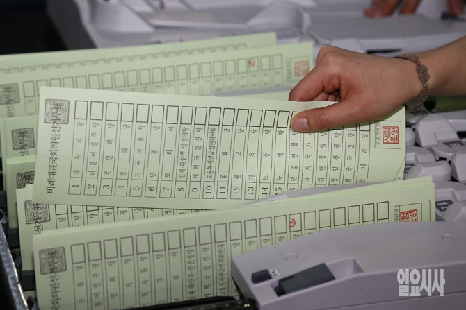 4.13 총선이 하루 앞으로 다가온 가운데 12일 오후 서울 영등포구 여의도고등학교에 설치된 개표소에서 선관위 관계자들이 개표소 설비를 점검하며 투표지분류기를 시험운영하고 있다.