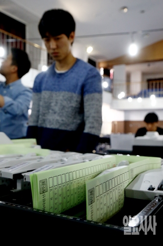 4.13 총선이 하루 앞으로 다가온 가운데 12일 오후 서울 영등포구 여의도고등학교에 설치된 개표소에서 선관위 관계자들이 개표소 설비를 점검하며 투표지분류기를 시험운영하고 있다.