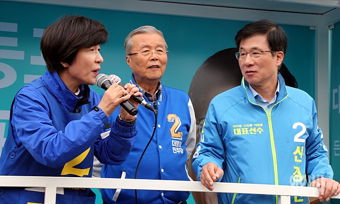 4·13 총선을 하루 앞둔 12일, 서울시 구로구 노인종합복지관에서 김종인 더불어민주당 비대위 대표(사진 가운데)가 영등포을 신경민(오른쪽) 후보와 영등포갑 김영주 후보의 선거 지원유세를 돕고 있는 가운데, 김 후보가 지지를 호소하고 있다.