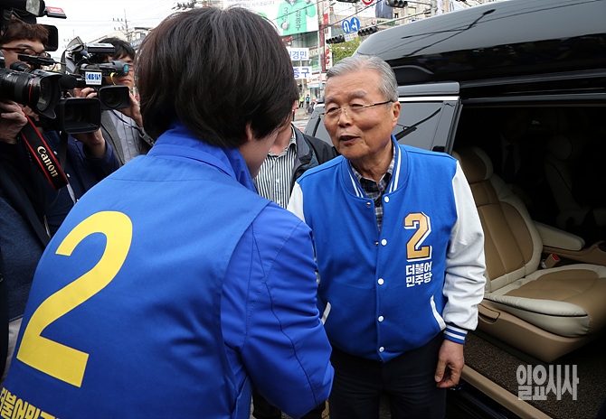 4·13 총선을 하루 앞둔 12일, 김종인 더불어민주당 비대위 대표(사진 오른쪽)가 서울시 구로구 종합노인복지관을 찾아 영등포갑 김영주 후보의 선거 지원유세차 방문해 김 후보와 악수를 나누고 있다.