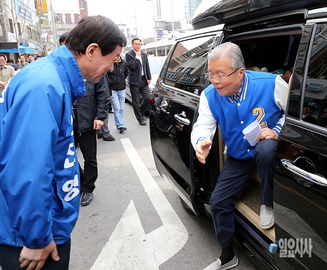 총선을 하루 앞둔 12일, 김종인 더불어민주당 비대위 대표가 서울 용산구 후암시장 앞에서 열린 진영 후보 지원유세를 위해 현장에 도착하고 있다.