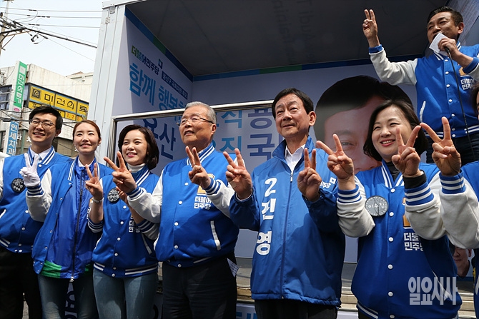 4·13 총선을 하루 앞둔 13일, 김종인 더불어민주당 비대위 대표와 용산 진영 후보, 선거 운동원들이 서울 용산구 후암시장 앞에서 손가락으로 '2번'을 호소하고 있다.