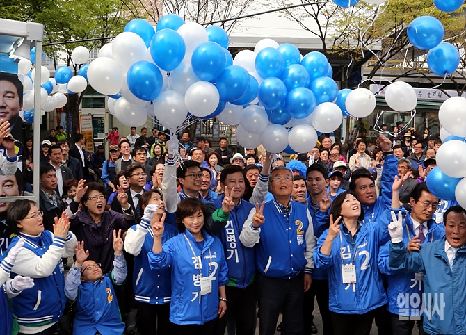4·13 총선을 하루 앞둔 12일, 김종인 더불어민주당 비대위 대표가 서울 동작구 노량진역 앞에서 선거운동원들과 함께 동작 갑 김병기 후보 선거지원 유세에서 손가락으로 '2번'을 들어보이고 있다.