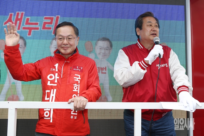 4.13 총선이 하루 앞으로 다가온 가운데 12일 오후 서울 마포구에서 안대희 새누리당 후보의 이동유세 지원에 나선 김무성 새누리당 대표가 유권자들에게 지지를 호소하고 있다.
