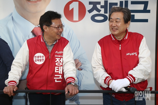 4.13 총선이 하루 앞으로 다가온 가운데 12일 오후 서울 성북구 한성대입구역에서 정태근 새누리당 후보의 이동유세 지원에 나선 김무성 새누리당 대표가 정후보와 대화를 하고 있다.