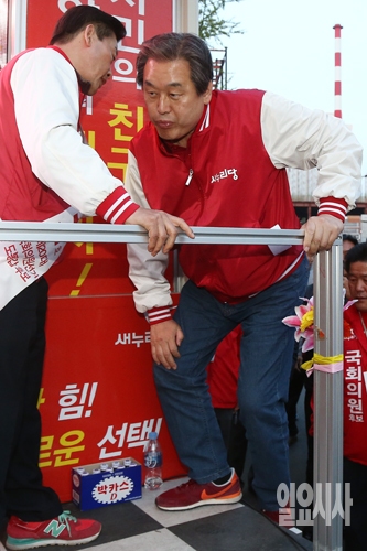4.13 총선이 하루 앞으로 다가온 가운데 12일 오후 서울 도봉구 이마트 창동점 앞에서 이재범 새누리당 후보의 지원유세에 나선 김무성 새누리당 대표가 유세차량에 오르고 있다.