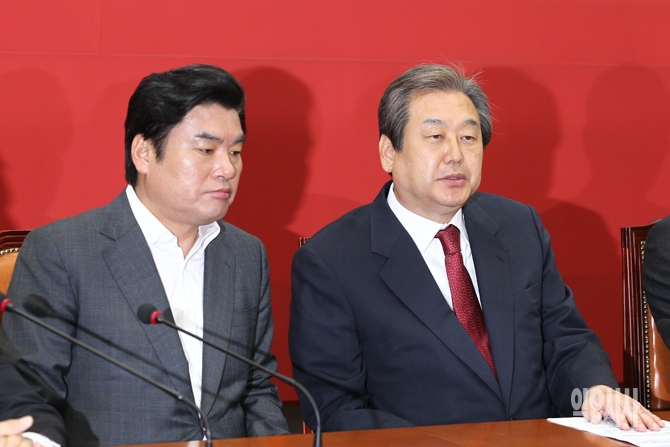 4.13 총선 이튿날인 14일 오전 서울 여의도 국회에서 열린 새누리당 중앙선대위 해단식에서 새누리당 김무성 대표와 원유철 원내대표가 대화를 하고 있다.