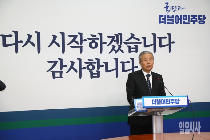 4.13 총선 이튿날인 14일 오전 서울 여의도 국회에서 김종인 더불어민주당 비대위 대표가 대국민 기자회견을 갖고 있다.