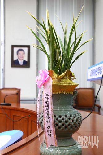 4.13 총선 이튿날인 14일 오전 서울 여의도 국회에서 열린 김종인 더불어민주당 비대위 대표 대국민 기자회견에 고 노무현 전 대통령의 부인 권양숙 여사가 보낸 난이 놓여 있다.
